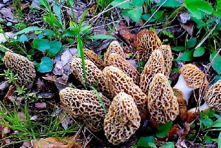 Morels are gathered in the woods. Typically this occurs in the early Spring. They can be very elusive, but look under the corners of downed trees, in thick leaves, and in areas recently burned by forest fire.